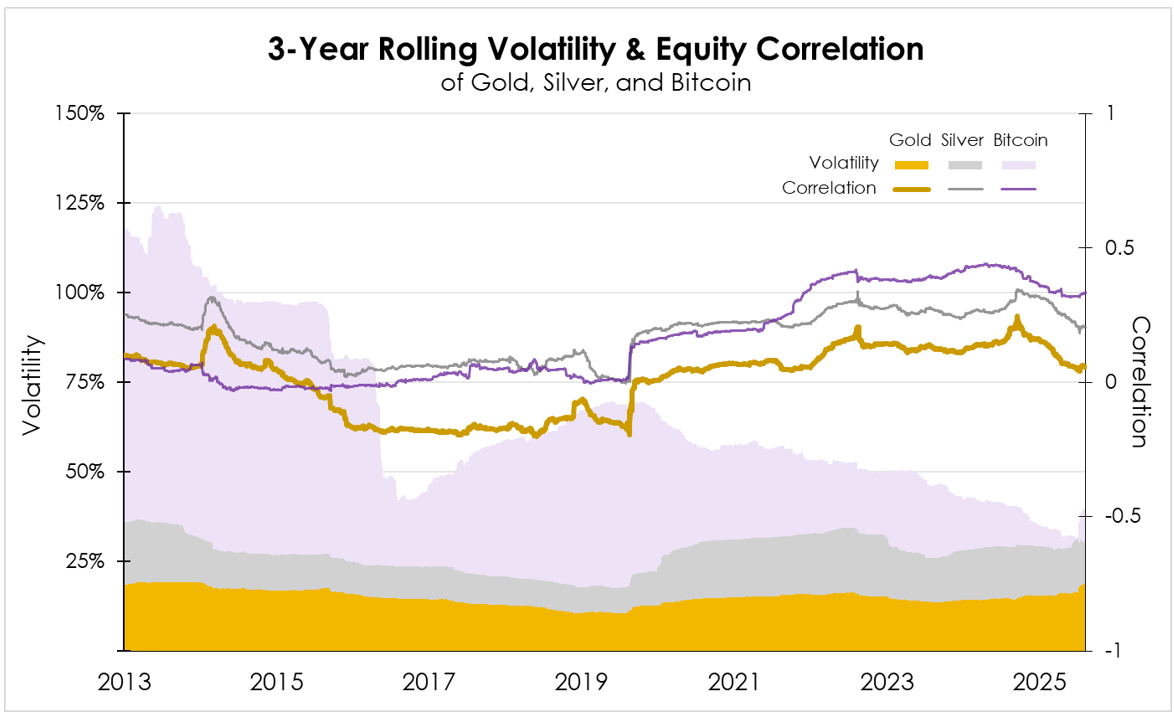 This divergence reinforces our strategic view: gold functions as a portfolio stabilizer with empirically demonstrated diversification properties, whereas other precious and digital assets have exhibited more episodic and flow-dependent behavior (note gold’s lower standard deviation and equity correlation below).