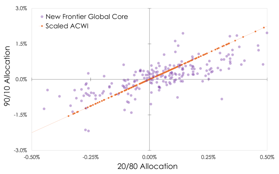 The chart below plots the daily returns YTD of our aggressive 90/10 portfolio (Y-axis) against our conservative 20/80 portfolio (X-axis). The orange line shows how returns would behave if both portfolios were simply scaled versions of the same index. In this case, daily returns from the ACWI adjusted to represent 90% and 20% equity exposure. The purple dots represent the realized returns of the optimized New Frontier portfolios. These deviate from the orange line, highlighting their different reactions to markets – observations in the top-left and bottom-right quadrants are examples where the two portfolios moved in opposite directions.
