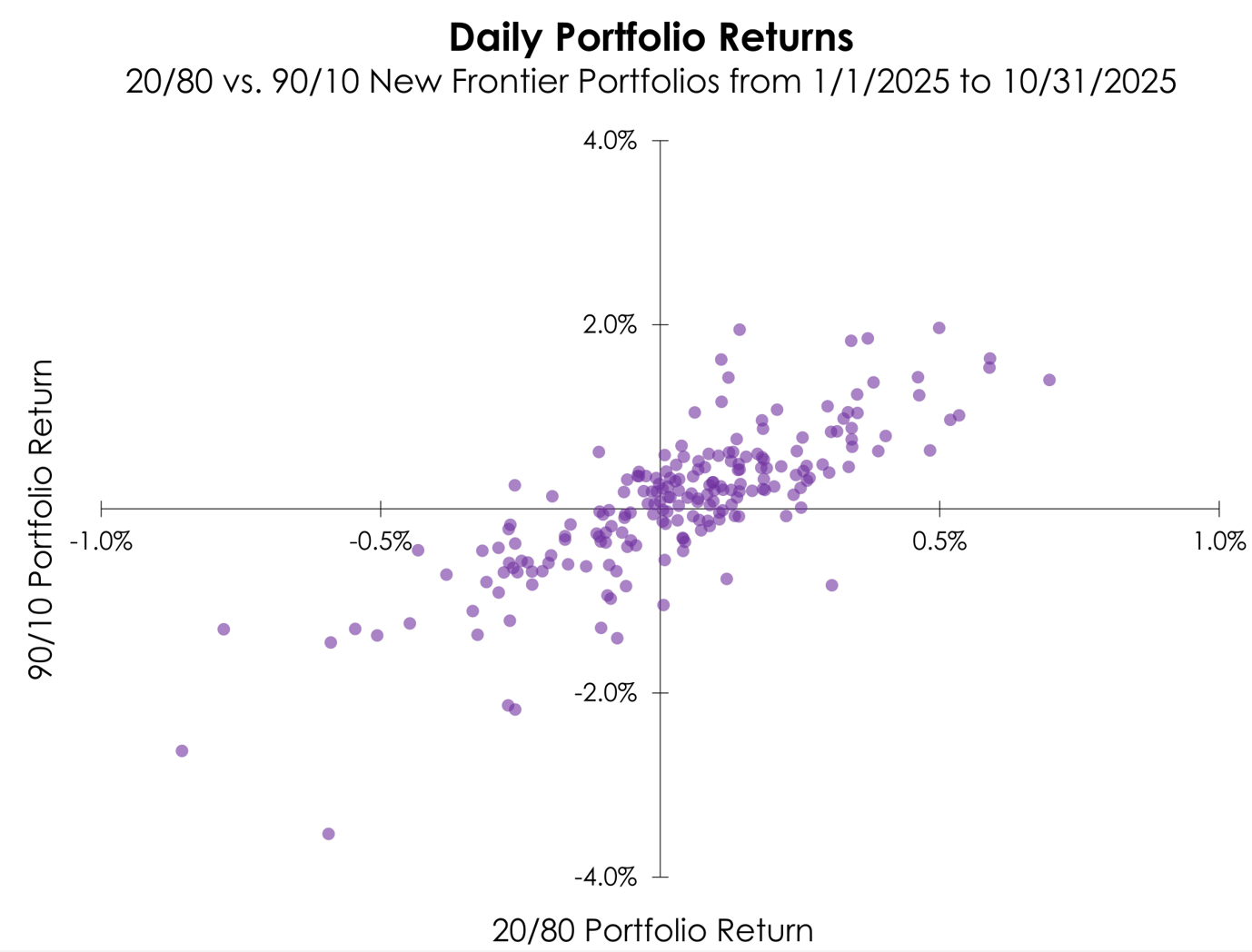 The chart below plots the daily returns YTD of our aggressive 90/10 portfolio (Y-axis) against our conservative 20/80 portfolio (X-axis). The purple dots represent the realized returns of both optimized New Frontier portfolios on a given date. These deviate from a straight-line relationship, highlighting their different reactions to markets day-by-day – observations in the top-left and bottom-right quadrants are examples where the two portfolios moved in opposite directions.