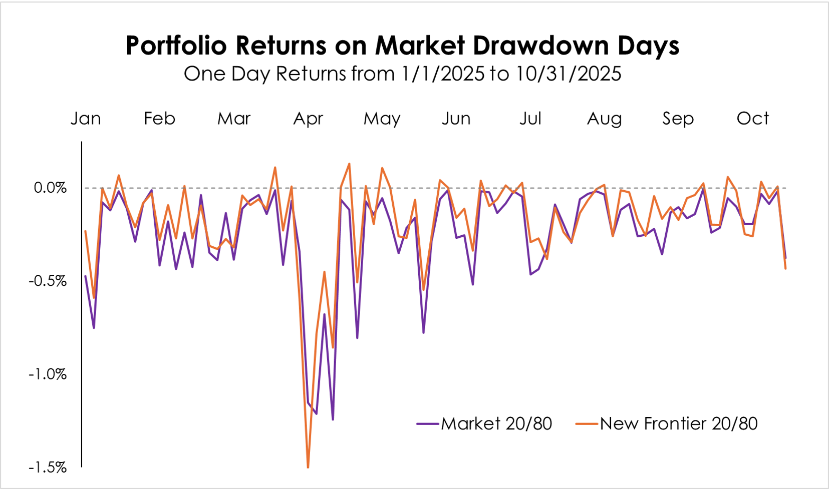 The chart below plots the daily returns YTD of both the 20/80 market portfolio (purple, calculated as 20/80 weighted ACWI/AGG daily return) and New Frontier’s optimized conservative 20/80 portfolio (orange), on days when the market lost value. While both were subject to the downside of the market, particularly the April volatility, the optimized portfolio generally exhibited less volatility and lower declines.